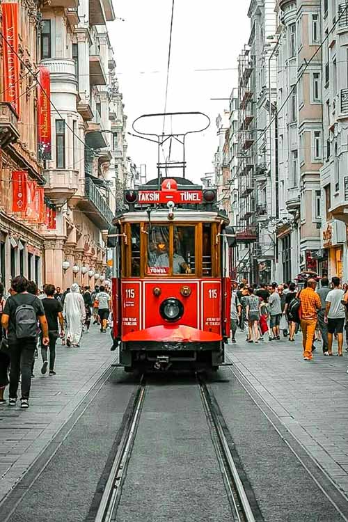 Das Schöne an Istanbul: Die Stadt hat kein langsames Warm-up. Kaum am Hotel, zieht sie dich schon raus. Unser Tipp für die Basis – gleich mehr dazu – liegt direkt neben dem Taksim-Platz, also genau dort, wo das moderne Istanbul pulsiert. Cafés mit Terrassenstühlen, die auf die Straße kippen, historische Fassaden, die Jahrzehnte schweigend erzählen, und die Istiklal Avenue gleich um die Ecke: eine der lebendigsten Flaniermeilen Europas, mit Theatern, Buchhandlungen, kleinen Weinbars und einem nostalgischen Straßentram, das seit Jahrzehnten dieselbe Strecke fährt.